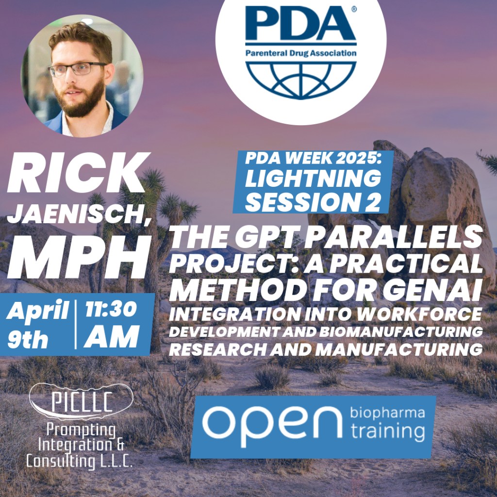 In May, Richard talked about a project we’re supporting with Open Biopharma Research and Training Institute called the GPT Parallels Project, with the PDA Pacific Northwest Chapter. Richard guided a presentation on how workforce development is being impacted by Generative AI, and how imperative guided learning is to a successful relationship between business and their employees.
